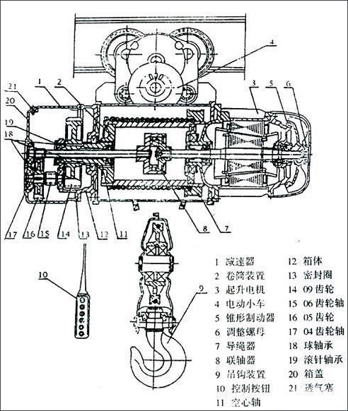 钢丝绳电动葫芦组成的部分大致可分为: 1.减速器 2.卷筒装置 3.起升电机 4.电动小车 5.锥形制动器 6.调整螺母 7.导绳器 8.联轴器 9.吊钩装置 10.控制按钮 11.空心轴 12.箱体 13.密封圈 14.09齿轮 15.06齿轮轴 16.05齿轮轴 17.04齿轮轴 18.球轴承 19.滚针轴承 20.箱盖 21.透气塞 钢丝绳电动葫芦组成部件 其中各部分的作用及功能如下: 减速器:是采用三级定轴斜齿轮传动机构,齿轮和齿轮轴均经过热处理的合金钢制成,箱体,箱盖由铸铁制成,装配严密,密封良好。 控制箱:是采用能在紧急情况下切断主电路,并带有一个上下行程保护段火限位器的装置。 钢丝绳:是采用型起重钢丝绳,它保证了经久耐用。锥形电动机:起升电机采用较大的动力矩锥形转子制动异步电动机,无须外加制动器。 按钮开关:采用手操式,轻巧灵便,分有绳操纵和无绳遥控两种方式。