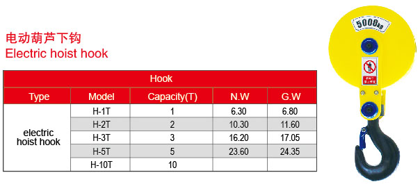电动葫芦下钩装置采用钢锻制而成,是钢丝绳电动葫芦重要组成部分之一,带安全防脱钩装置,通常配套于CD/MD 型钢丝绳电动葫芦并用推力球轴承吊钩横梁与外壳联接,使吊钩运转自如.配有保险卡防止重物脱钩,安全可靠。